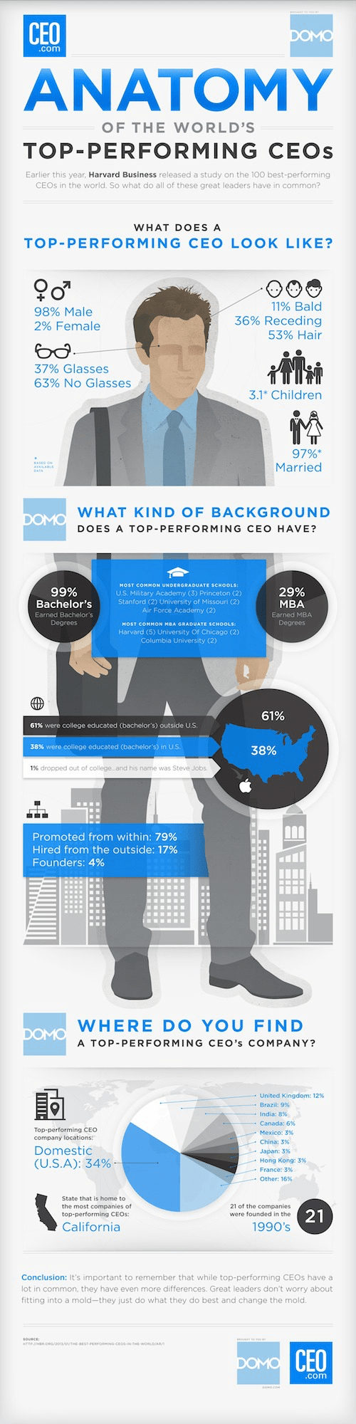 I recently viewed a Forbes article with an Infographic on what top performing CEO’s look like put together by CEO.com and Domo.
